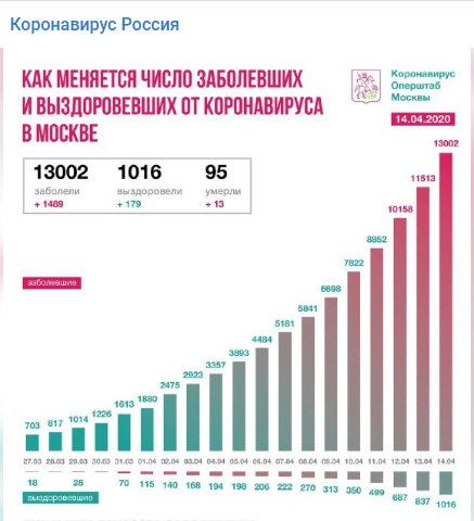 У Telegram-каналі "Коронавірус Росія" повідомляється, що в Москві за станом на ранок 14 квітня зареєстровано 13002 хворих на Covid-19, при цьому 1016 осіб одужали, а 95 - померли.