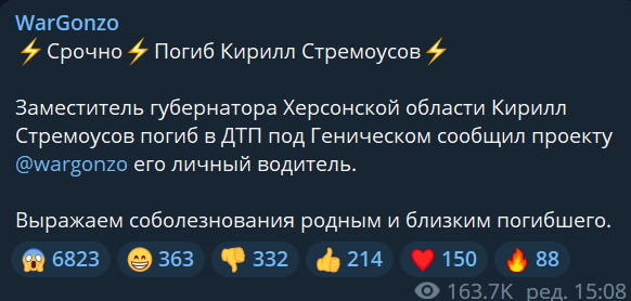 Пізніше факт смерті Стремоусова підтвердили в адміністрації окупованої Херсонщини, про що повідомили російські державні "ЗМІ".