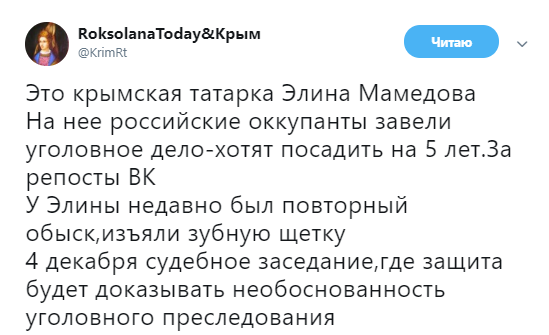 "Це кримська татарка Еліна Мамедова. На неї російські окупанти завели кримінальну справу-хочуть посадити на 5 років. За репости ВК. У Еліни недавно був повторний обшук, вилучили зубну щітку. 4 грудня судове засідання, де захист доводитиме необгрунтованість кримінального переслідування", - йдеться у повідомленні.
