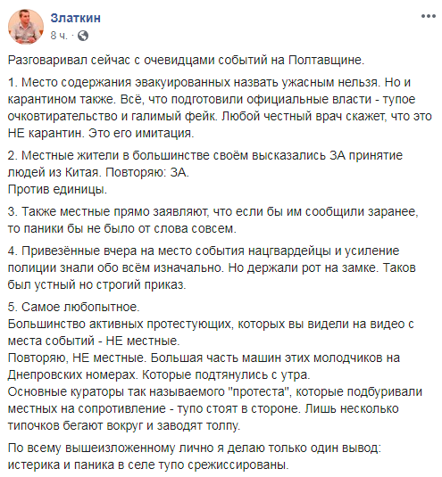 Златкін зробив висновок, що протест в Нових Санжарах був постановочний і куплений. Але у волонтера немає припущень, хто може за цим стояти.