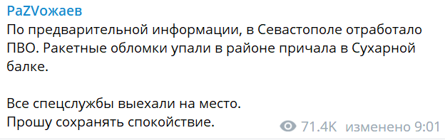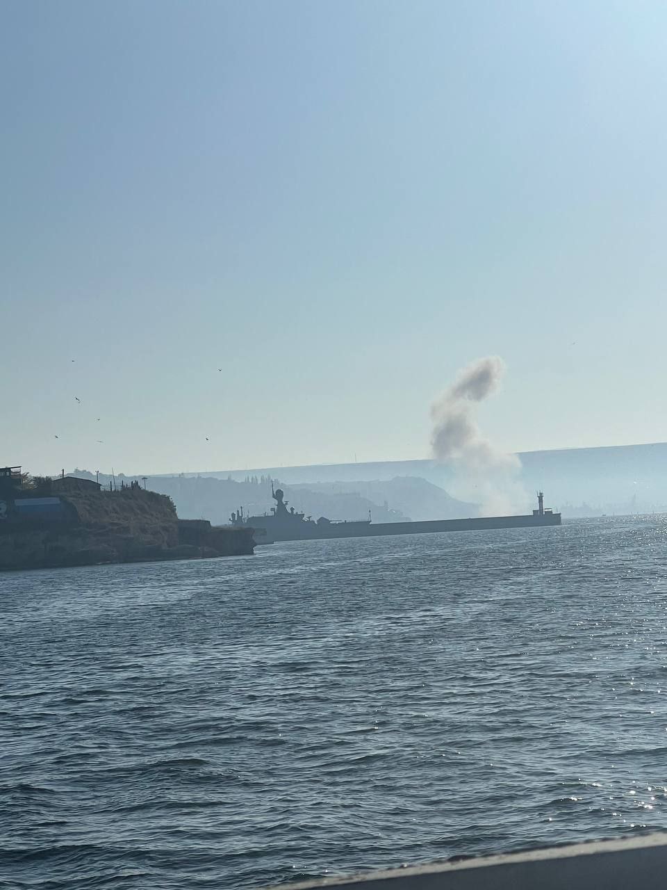 Місцеві пропагандистські Telegram-канали заявляють про атаку безпілотниками та ракетами берегового комплексу. Також публікують фото нібито БПЛА, який завис у небі над Корабельною бухтою у Севастополі.