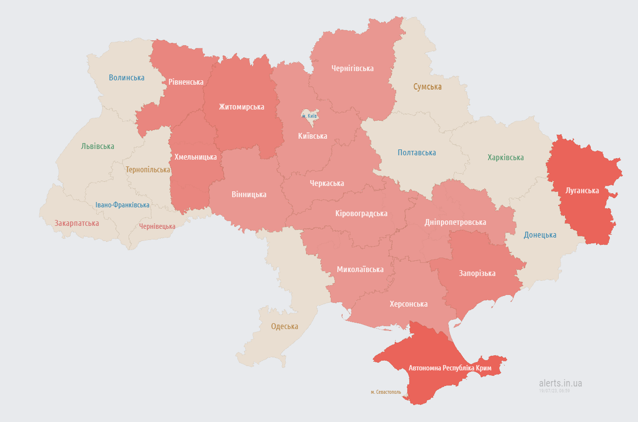 У середу, 19 липня, після масованої комбінованої атаки ракетами і "шахедами" вночі, в частині України оголосили повітряну тривогу.