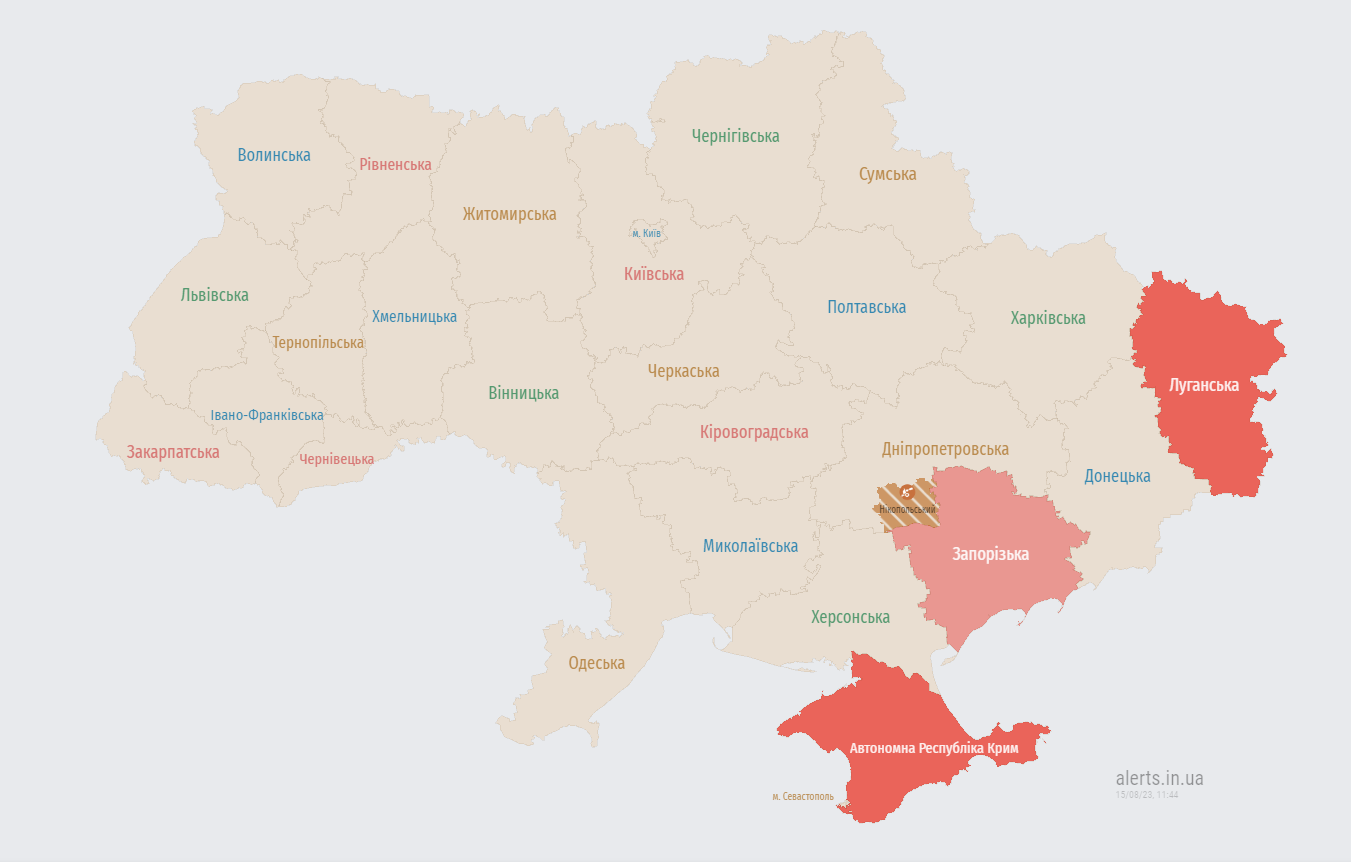 По 11-й годині у вівторок, 15 серпня, після масованого удару по західних областях в східних областях України оголосили повітряну тривогу через ракетну небезпеку. Під загрозою ударів можуть опинитися мешканці низки областей.