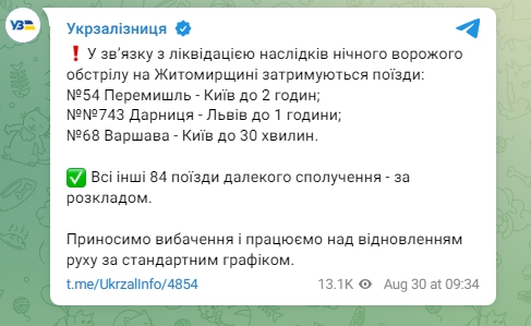 У середу, 30 серпня, "Укрзалізниця" попередила про затримку деяких поїздів у зв'язку з ліквідацією наслідків нічного ворожого обстрілу на Житомирщині.