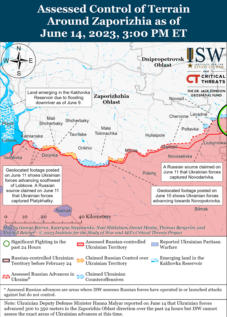 14 червня українські сили продовжували проводити обмежені наземні атаки на заході Запорізької області. Українські офіційні особи повідомили, що ЗСУ продовжують активні бойові дії з російськими військами поблизу населених пунктів Новоданилівка та Новопокровка.
