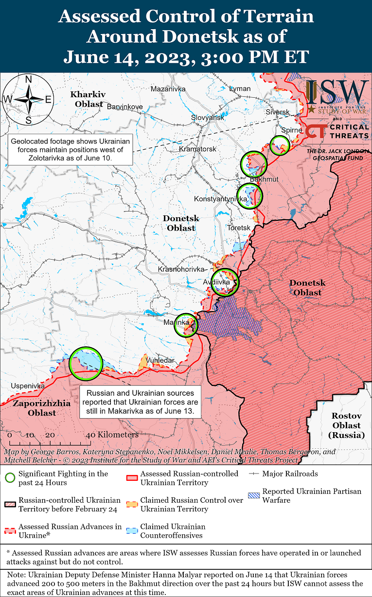 Геолокаційні знімки, опубліковані 14 червня, свідчать про те, що українські сили все ще контролюють Макарівку. Російське Міністерство оборони заявляло, що вони відбили українські атаки на південний захід і південний схід від Великої Новосілки.
