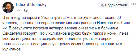 Глава Українського єврейського комітету Едуард Долинський повідомив, що в побитті брали участь близько 30 людей. За його словами, уманські євреї організовують спеціальну групу самооборони для захисту від хуліганів.