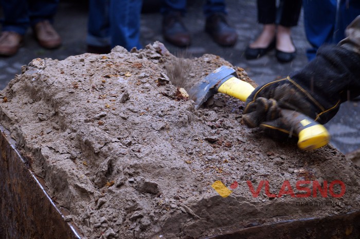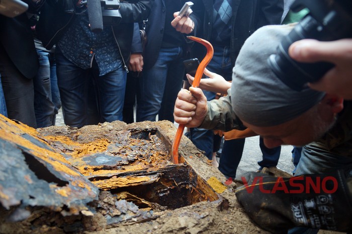 Сейф розкривали більше півтори години на подвір'ї обласного краєзнавчого музею у присутності журналістів. Відзначається, що ніяких цінностей в сейфі не знайшли, але знайшли шматки документів, надрукованих на друкарській машинці російською мовою. Частково вони були покриті іржею і золотистим пилом.