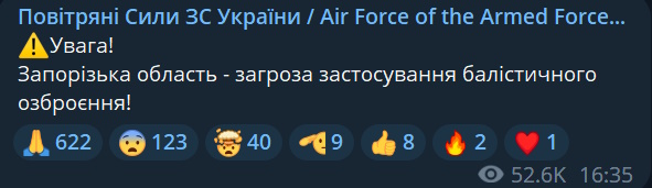У командуванні Повітряних сил України попередили про загрозу застосування балістичної зброї.