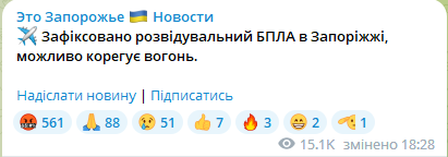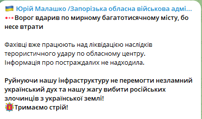 За інформацією начальника Запорізької обласної військової адміністрації Юрія Малашка, в місті є влучання по інфраструктурному об'єкту.