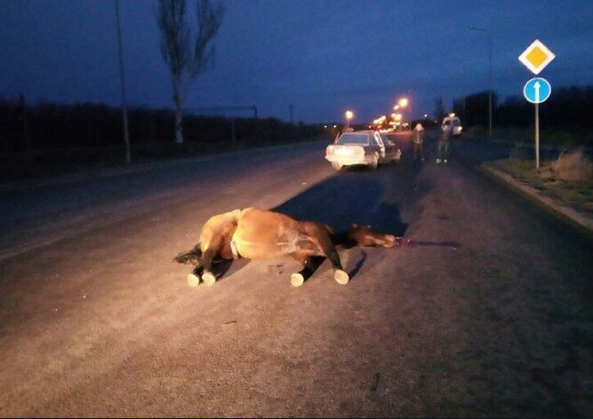 Труп тварини помітили ще вночі. Машина зникла з місця події. На ранок мертвий кінь так і лежав на дорозі, але його накрили покривалом.
