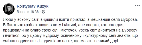 "Люди в усьому світі вирішили взяти приклад з жителів села Дуброва. У багатьох країнах люди в поту і кіптяві, але наполегливо, щодня, працювали на благо своїх сіл і містечок. Весь світ дивиться на Дуброву і вчиться, тому що в цьому мудрому, освіченому і культурному селі знають, що вміння подивитися з вдячністю те, що маєш - велика Божа ласка! ", - іронізує автор фотожаб.