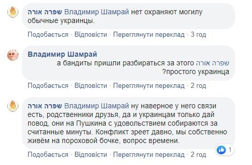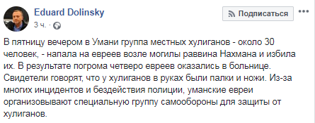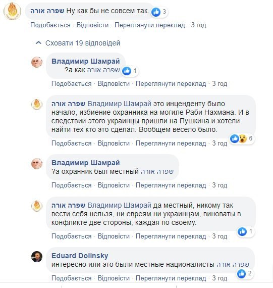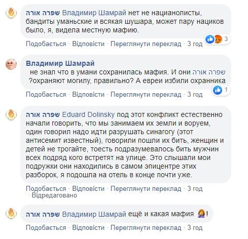 У коментарях до посту глави Українського єврейського комітету Едуарда Долинського повідомляють, що конфлікт почався після того, як був побитий українець, охоронець могили рабина. Після цього деякі з місцевих жителів зібралися, щоб знайти винних у побитті.
