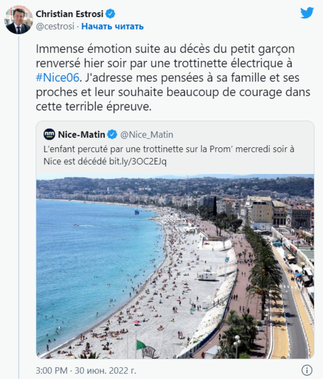 У зв'язку з трагедією мер Ніцци Крістіан Естрозі виразив свої співчуття у твіттері та побажав батькам дитини "багато мужності у цьому випробуванні".