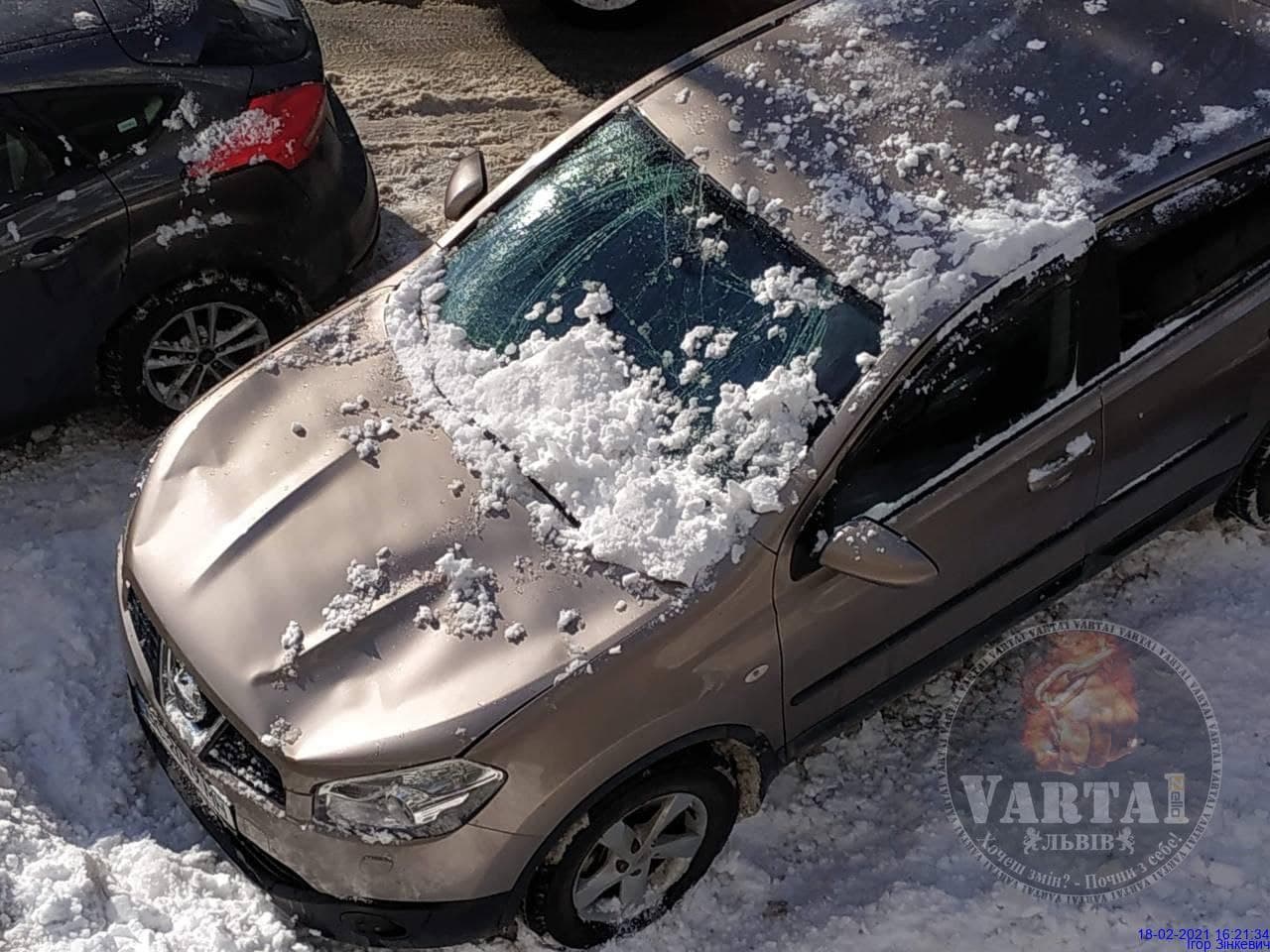 У четвер, 18 лютого, у Львові внаслідок падіння снігових брил зазнали пошкоджень три автомобілі, що стояли припаркованими.