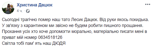 "Сьогодні трагічно помер наш тато Лесик Дацюк. Від руки якогось покидька. У зв'язку з карантином ми, звичайно, не будемо робити пишного прощання", - написала вона на своїй сторінці в Facebook.