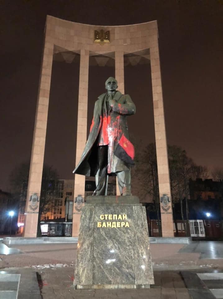 У Львові в ніч на 5 лютого невідомі облили червоною фарбою пам"ятник Степану Бандері.