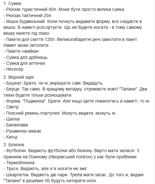 "З завтрашнього дня починаються військові збори. Тих, хто сподівається провести їх в "184 новеньких казармах" мушу розчарувати. Вас чекає грудень, сніг, намети. Щоб трохи полегшити збір речей, викладую свій список. Він великий (передбачено майже все), але влазить в 80-л рюкзак. Звісно, хтось поїде з маленькою сумкою, в якій тільки запасні шкарпетки та пляшка горілки, на смак та колір фломастери різні...", - написав він.