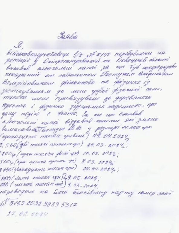 "Також я встановив багато незаконних фактів, зокрема побиття військових, якщо вони вживали алкоголь, але не платили гроші. В основному знущаннями над бійцями займався син начштабу Пастуха і похресник комбрига Побережнюка – на той момент старший лейтенант, а зараз уже капітан, Владислав Пастух, який був командиром одного зі взводів у першому батальйоні".