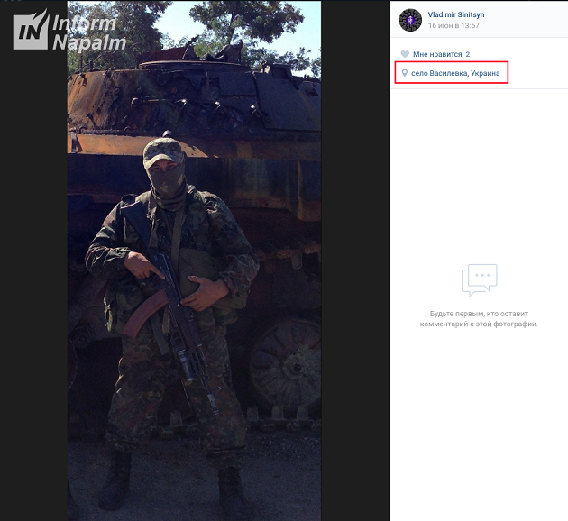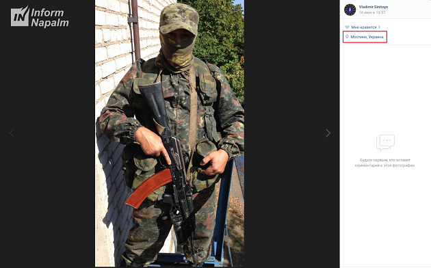 На сторінці ще одного найманця з Росії, Володимира Синіцина, також опубліковані фото з російськими снайперськими гвинтівками. Судячи з геолокації на знімках, росіянин проходить службу в так званій 1-ій ОМСБр 1-го армійського корпусу.