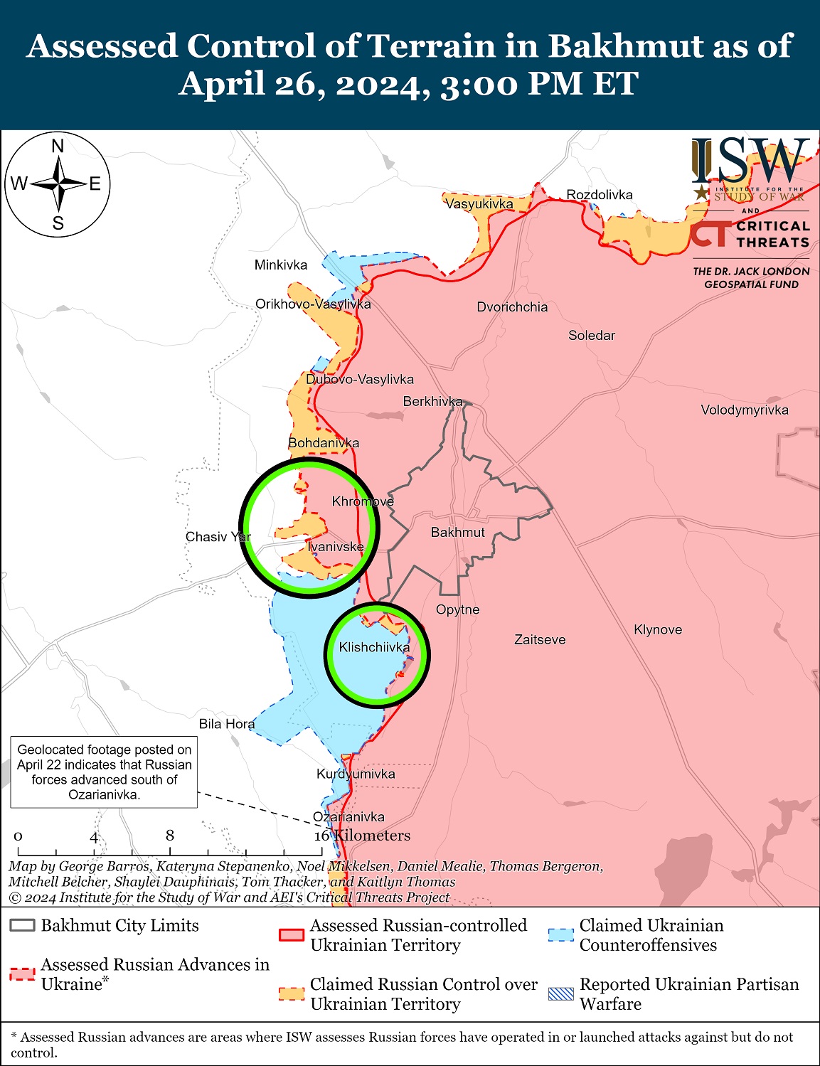Війська РФ продовжували наступ в районі Часового Яру. Окупанти атакують Богданівку, Іванівське, Кліщіївку та Андріївку з метою обійти Годин Яр та створити умови для оперативного оточення та захоплення населеного пункту. Росіяни зосередили особовий склад біля Кліщіївки та Білої Гори, накопичують боєприпаси та активно розмінують лінію фронту.