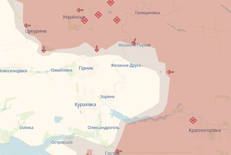 Аналітичний ресурс зауважує, що ворог завершив повну окупацію Красногорівки, а також просунувся в Цукуриному та біля Гірника, що в Покровському районі Донецької області.