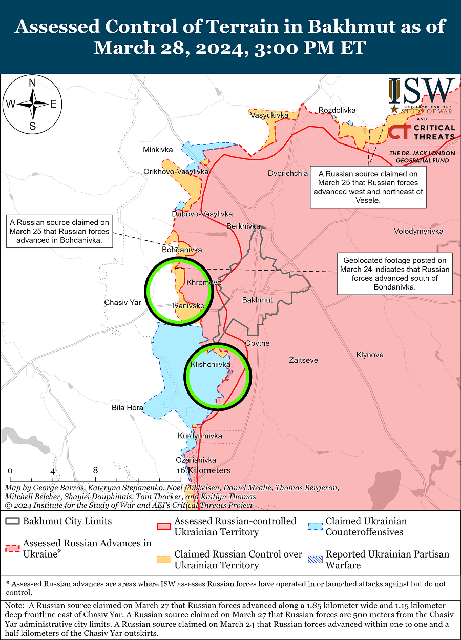- на південний захід від Бахмута в районі Кліщіївки та Андріївки.