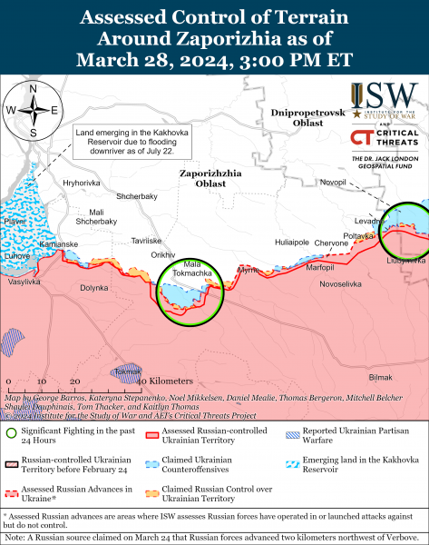 Позиційні бої тривали на заході Запорізької області 28 березня, але підтверджених змін на фронті не було.