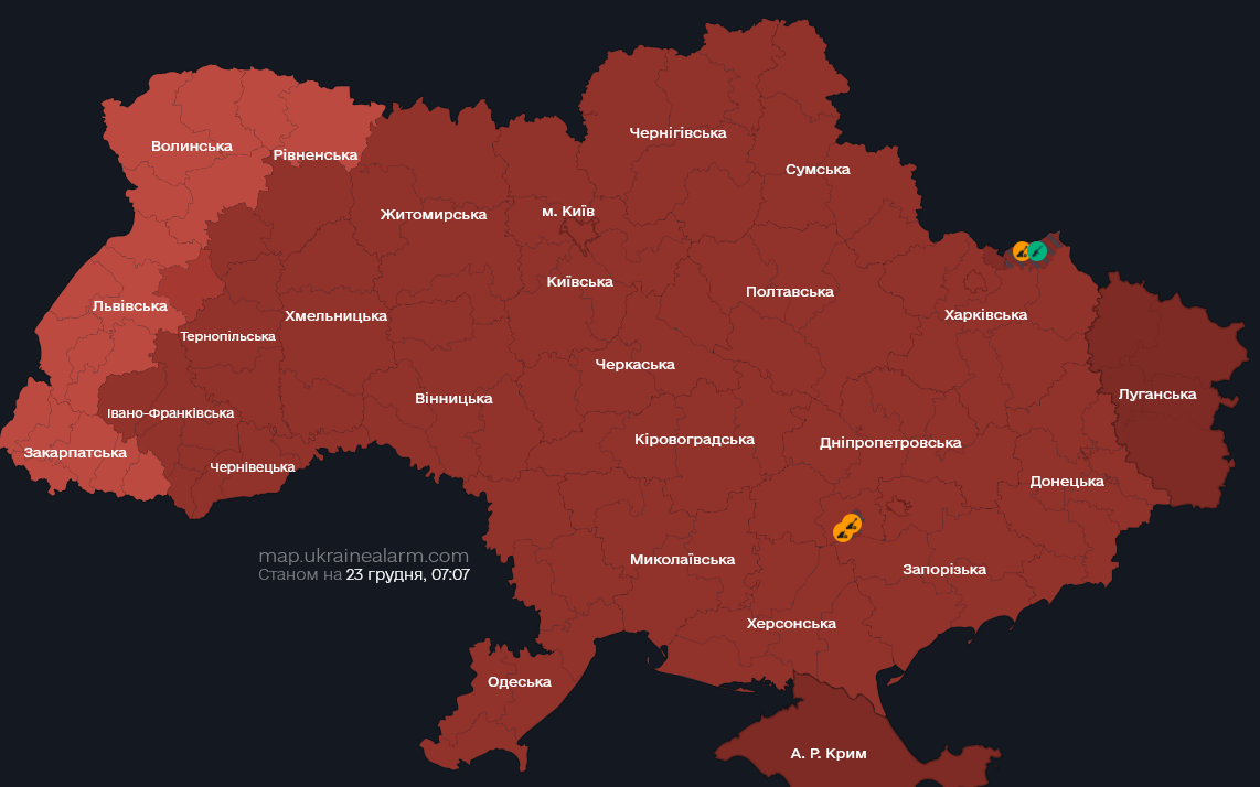 Ранок вівторка, 23 грудня, розпочався для України з тривалої повітряної тривоги та комбінованого обстрілу. Російські війська вкотре вдалися до комбінованої тактики, поєднуючи запуск ударних безпілотників із масованим ракетним ударом. Ситуація в повітряному просторі залишається напруженою.