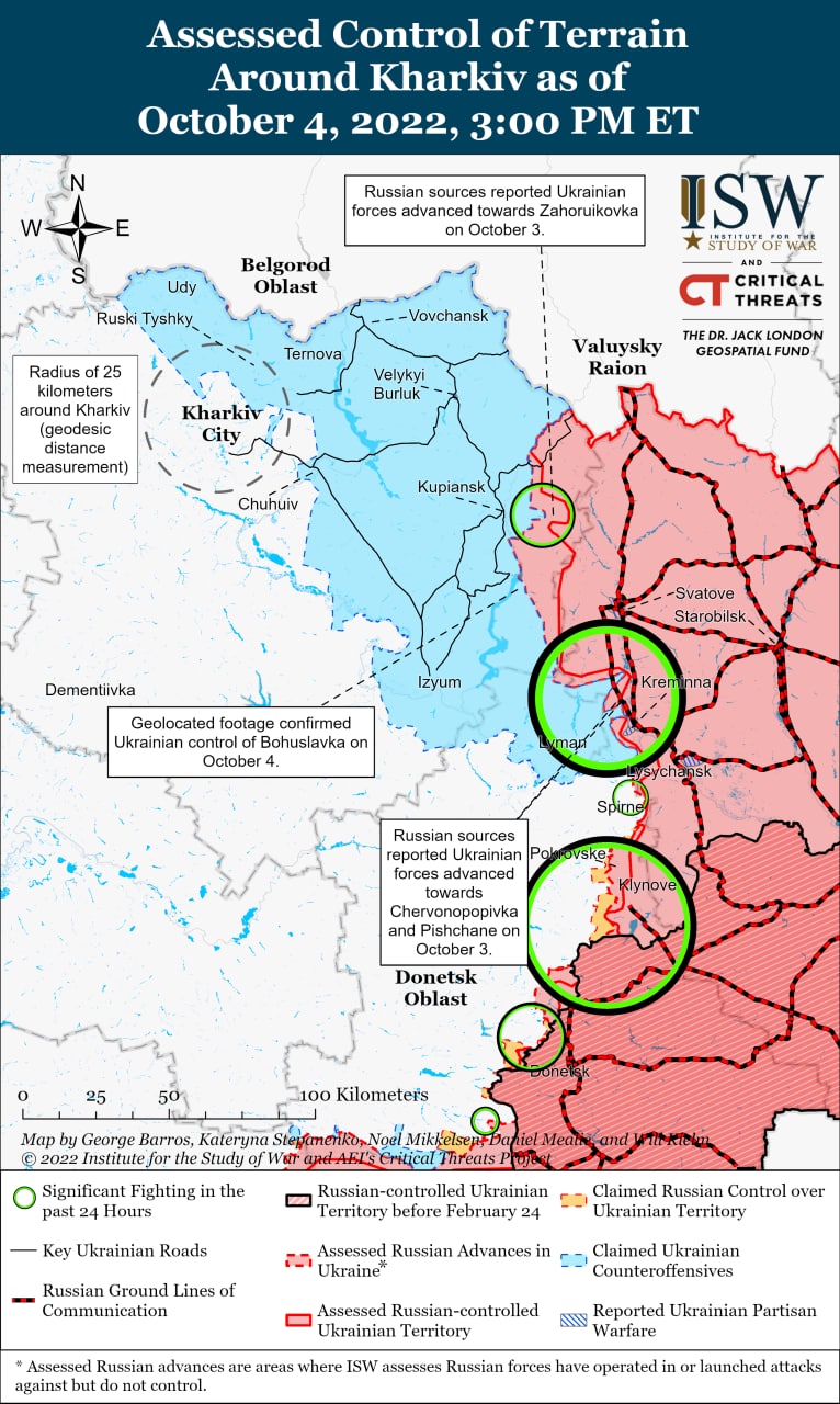 За словами аналітиків, українські війська також продовжують просування на схід від річки Оскол у Харківській області, а російські джерела стверджують, що бої продовжуються біля траси Р66 Сватово-Кременна.