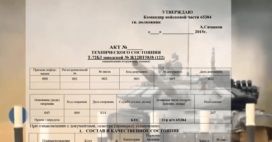 В сюжеті продемонстровано Акт технічного стану танку Т-72Б3 заводський номер №Ж12ВТ5838 (122).