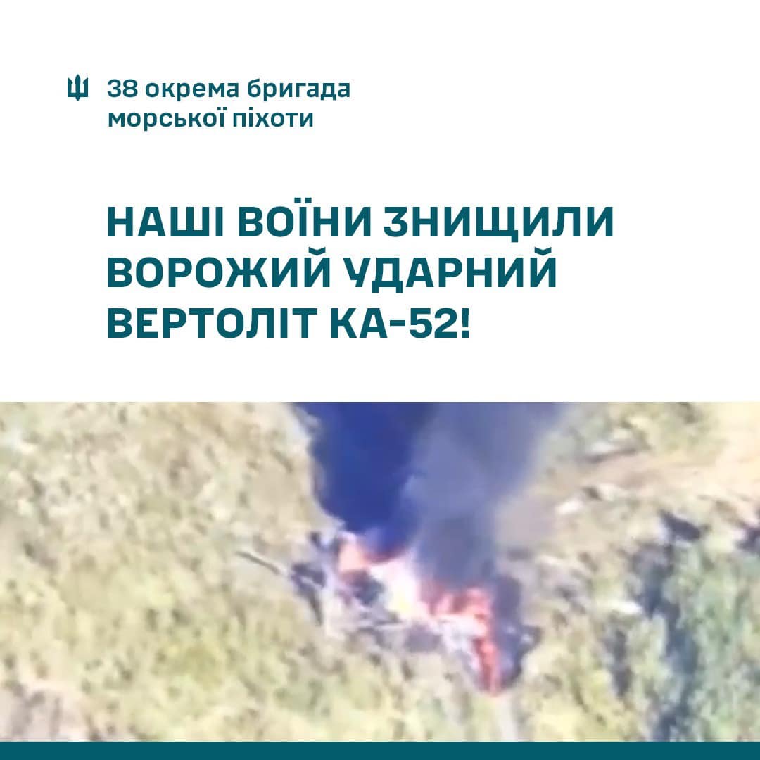 "Ранок морпіхів починається не з кави. Сьогодні о 7:43 розрахунком ПЗРК нашої бригади був знищений ворожий Ка-52. Слава морській піхоті України!", - йдеться в повідомленні.