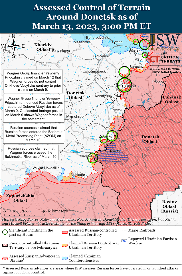 Окрім цього, Збройні сили Російської Федерації продовжували наступ у Бахмуті та його околицях, імовірно, просунувшись вздовж траси Е40 Бахмут-Слов'янськ. На кадрах з геолокацією, опублікованих 12 березня, видно, що окупанти також продовжили просування на північний захід від Бахмута в районі Богданівки.