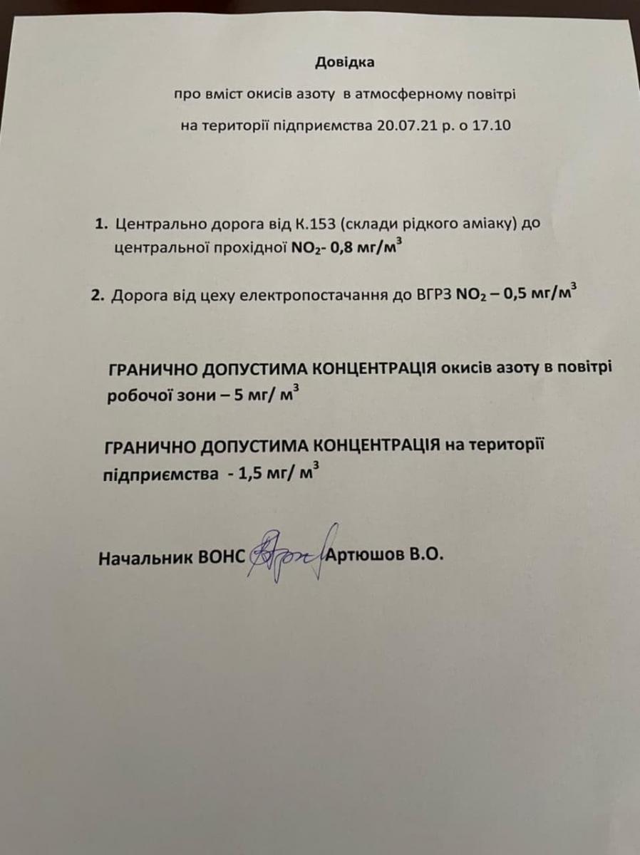 У Державній службі надзвичайних ситуацій заявили, що про ситуацію дізнались з інтернет-ресурсів. На місце події направили підрозділи ДСНС. Встановлено, що відбулась розгерметизація трубопроводу з цеху виробництва азотної кислоти та викид у атмосферу газу. На даний час ситуація під контролем, проводиться моніторинг