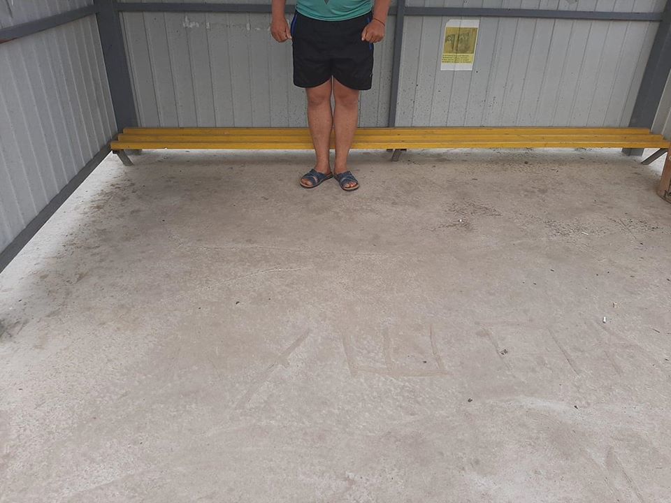 На першому фото видно, що лавочка на зупинці розміщена майже на рівні землі, а на другому фото - майже на рівні плечей людини.