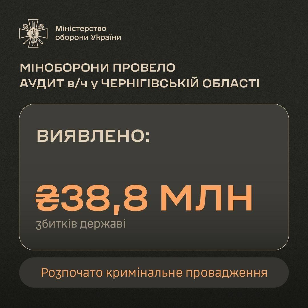 "Служба внутрішнього аудиту Міноборони, у співпраці з правоохоронними органами, провела перевірку однієї з військових частин у Чернігівській області. Аудитори встановили порушення, що спричинили збитки державі на суму 38,8 млн грн", - йдеться у повідомленні.
