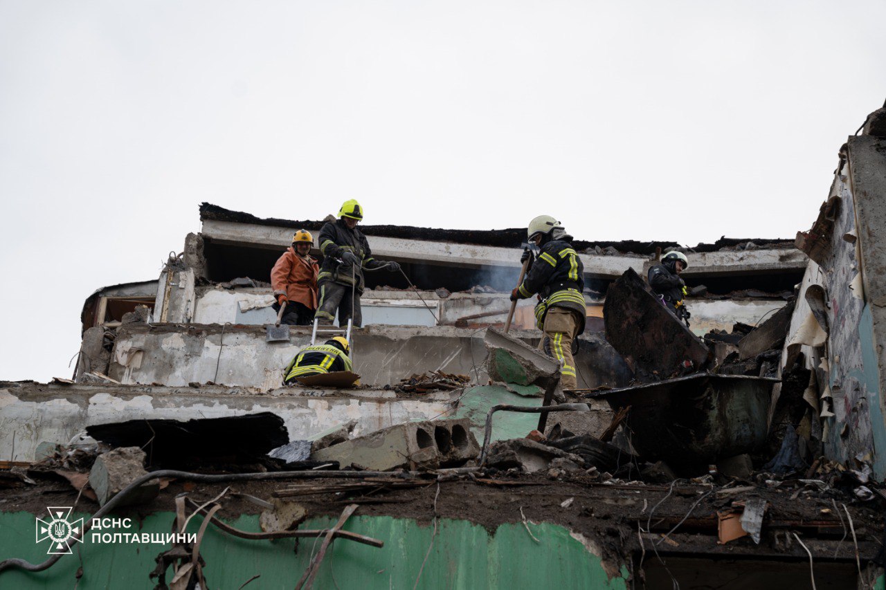 У Полтаві на місці зруйнованої ворожою ракетою п'ятиповерхівки завершені аварійно-рятувальні роботи. Жертвами російської атаки стало 14 людей.