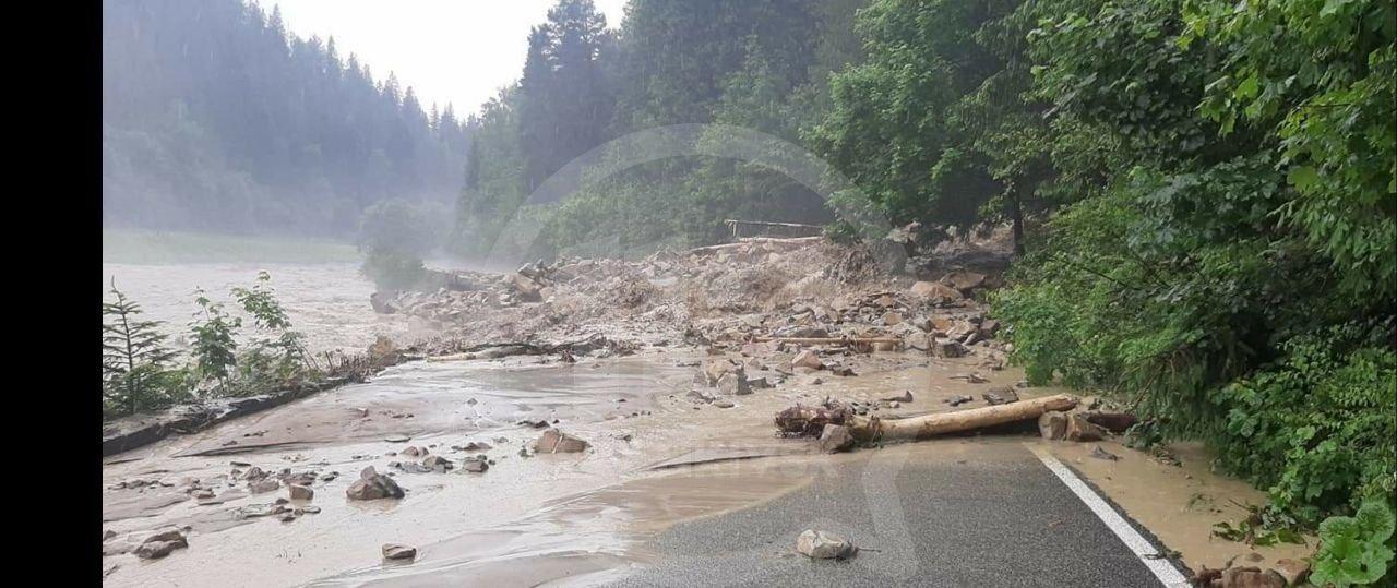 На дорозі між Яремче та Микуличином на Прикарпатті стався зсув ґрунту. Через рясні зливи затопило курорт "Буковель" в Івано-Франківській області.