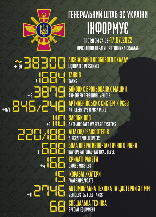 Загальні бойові втрати противника з 24.02 до 15.07 орієнтовно склали: