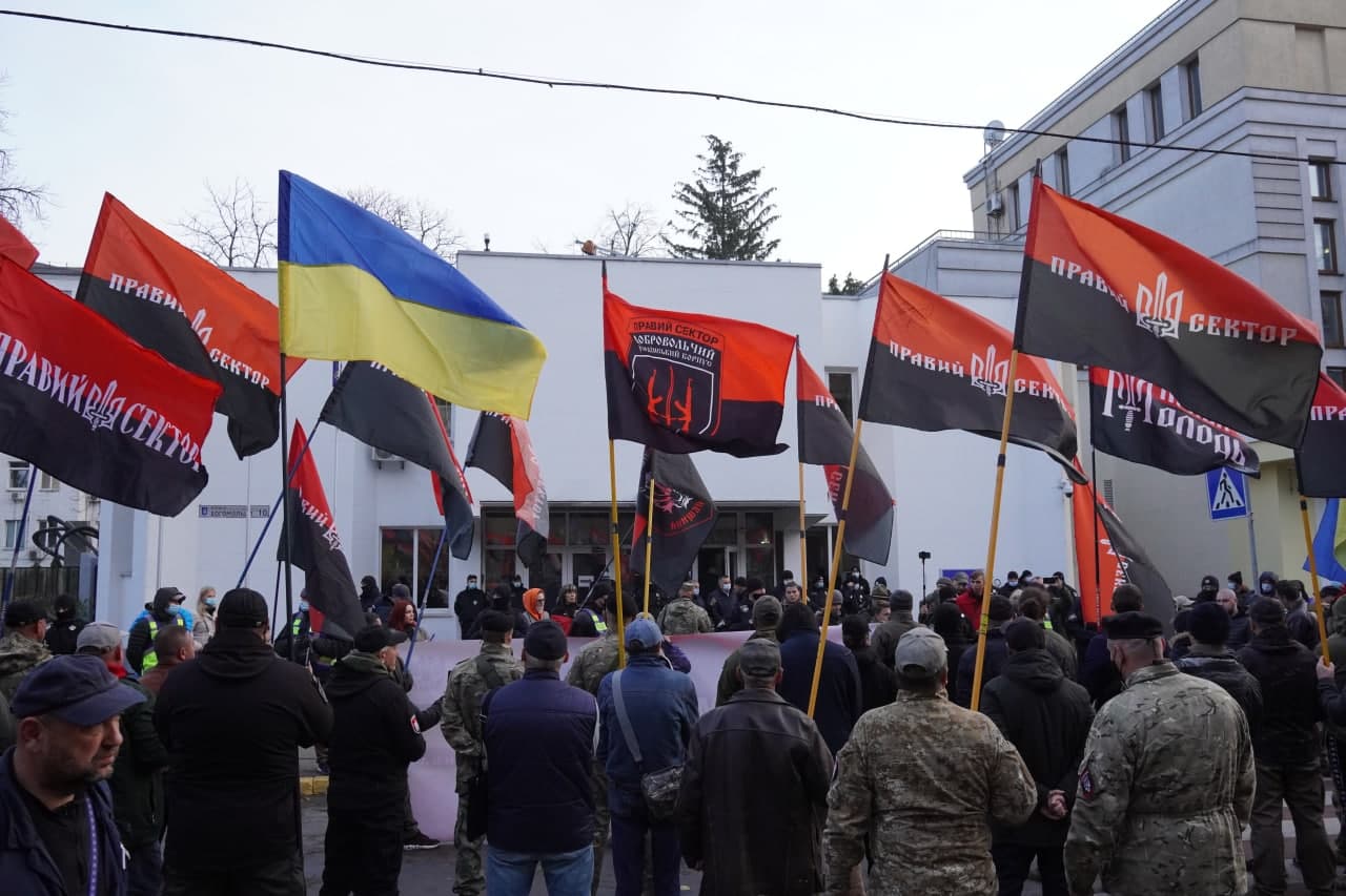 Біля будівлі МЗС бійці ПС, С14 та Проводу ОУН запалили фаєри.