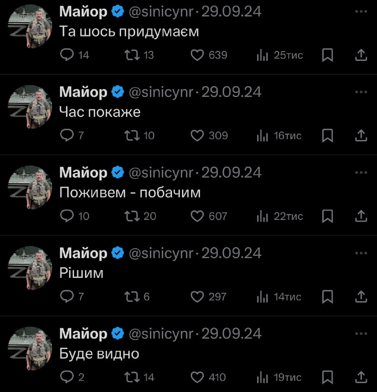 "План перемоги", складений з твітів офіцера ЗСУ "Майора" Романа Синіцина, набирає популярність в Х.
