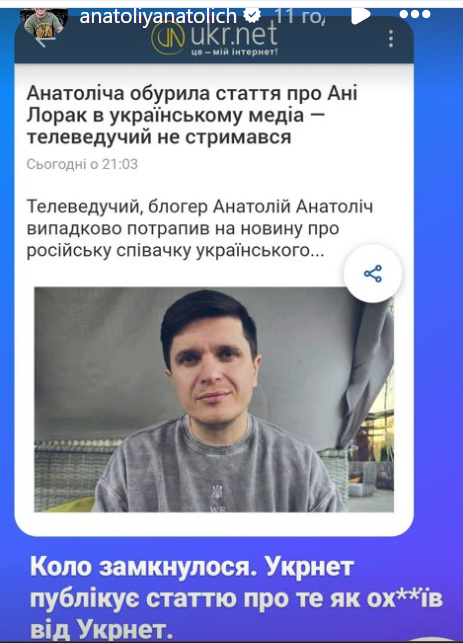 Про це він написав на своїй сторінці в instagram, опублікувавши скрін матеріалу про свою ж реакцію на публікацію про Ані Лорак.