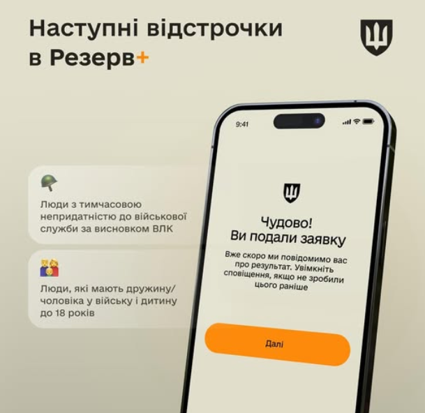 "Нашу команду часто запитують "Які відстрочки запустяться наступними в Резерв+ і коли?" Цього тижня запрацювали відстрочки для людей з інвалідністю без пенсійного посвідчення. А сьогодні хочу поділитися з вами, які відстрочки з"являться у застосунку до кінця мобілізації 8 травня", - повідомила представниця оборонного відомства.