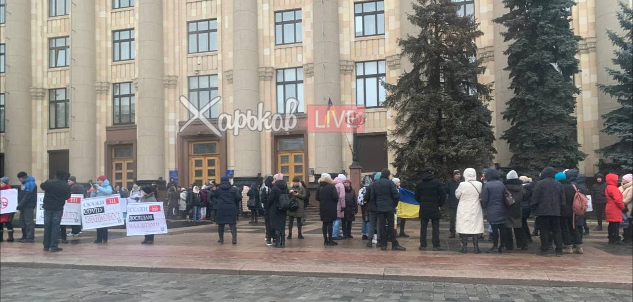 У Харкові також зібралося десятки людей, які виступають проти вакцинації від коронавірусу. Telegram-канал "Харків LIVE" опублікував фото з місця події, де видно плакати з гаслами протестувальників: "Скажи "ні" дослідам над дітьми", "Скажи "ні" COVID фашизму" тощо.