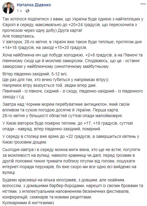 У вівторок, 28 квітня, в Україні буде тепло, протягом дня +14+18 градусів, на заході +15+20 градусів, хоча найближча ніч ще побуде холодною, +2+8 градусів, а на півночі та північному сході ще й можливі заморозки.