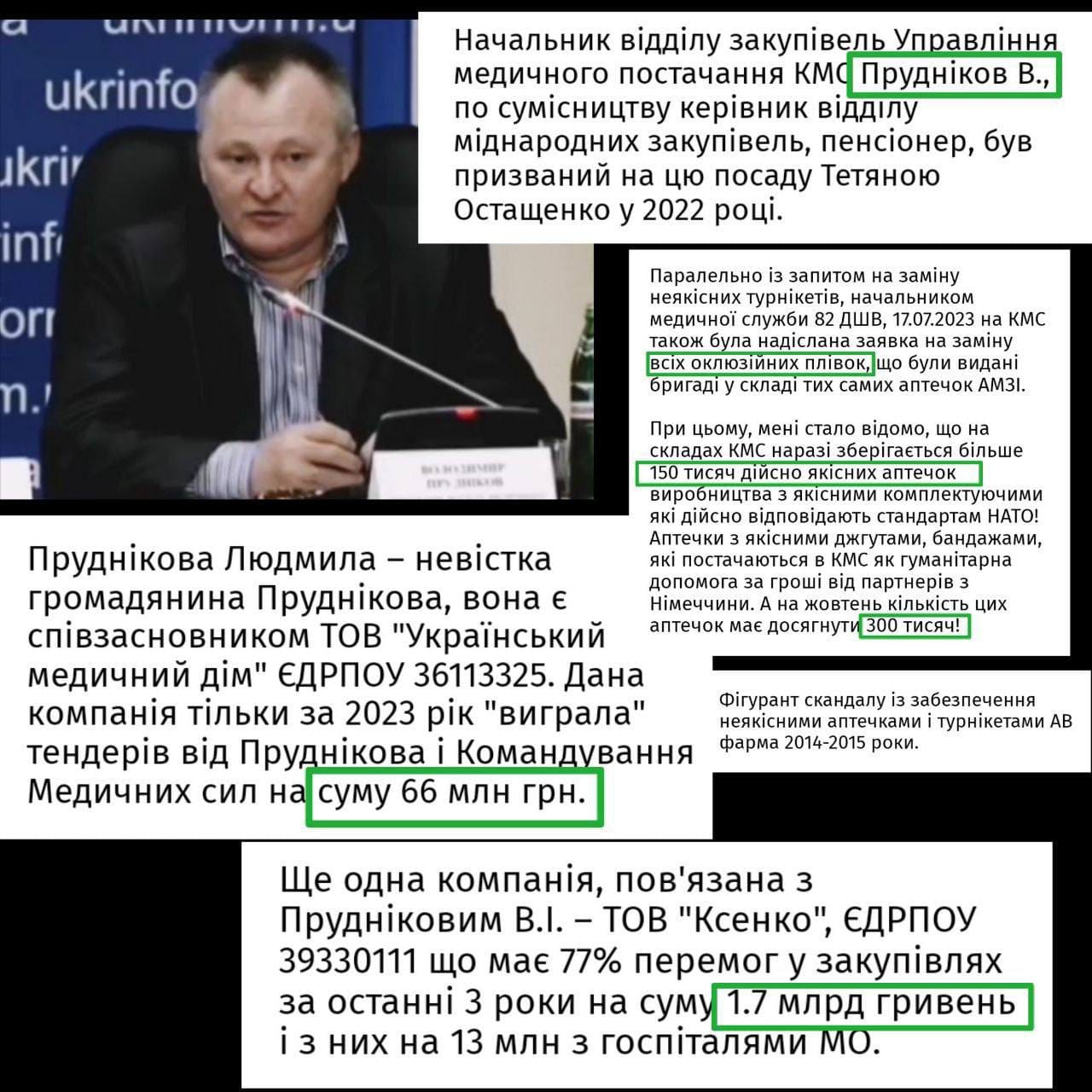 При наявності на складах КМС 150 тисяч якісних аптечок, начальник відділу закупівель Управління медичного постачання Володимир Прудніков поставив на фронт китайські низькосортні турнікети IFAK, які були закуплені в ТОВ "Український медичний дім", співзасновником якого є його невістка.