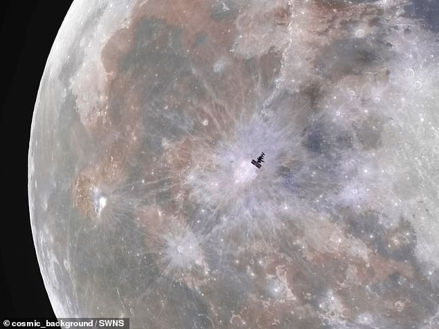 Фото Міжнародної космічної станції - надзвичайно рідкісна фотографія, оскільки космічний корабель був освітлений на частку секунди під час проходження перед Місяцем.