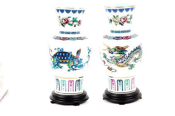 Яскраві дракони та символи удачі ідеально поєднуються у цій незвичайній фарфоровій вазі.