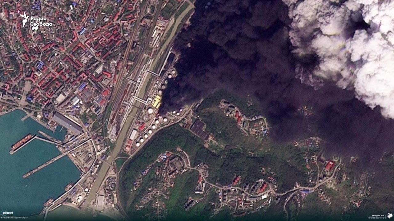 У мережі з'явились нові супутникові знімки з новою пожежею на території резервуарного парку Туапсинського нафтопереробного заводу (НПЗ) у Краснодарському краї у РФ після атак у ніч на 20 квітня.