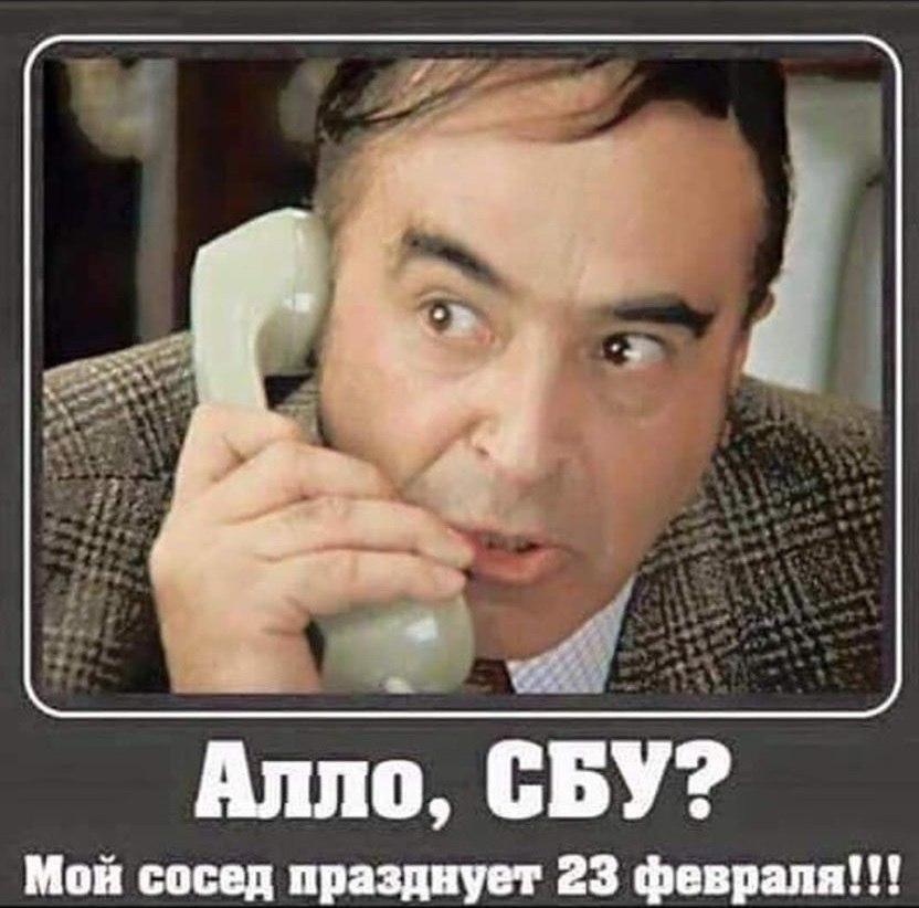 На одній з картинок зображений герой відомої радянської кінокомедії "Іван Васильович змінює професію" громадянин Шпак, який дзвонить в правоохоронні органи і повідомляє про сусіда, який святкує 23 лютого.